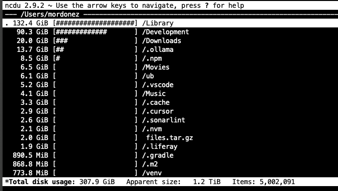 Soy una persona bastante procrastinadora y a la que me dejo un poco, el espacio en disco se queda sin espacio como si no hubiera un mañana, men suele pasar en el escritorio como en los contenedores del homelab. Pero hoy he descubierto esta maravilla NCDU que sirve para estos servidores remotos sin GUI y también en local. En la prueba de local, me ha analizado el disco de 256 GB del macbook en menos de 2 minutos, la verdad me he quedado asombrado con la rapideza que lo ha hecho y además su interficie minimalista y funcional me ha encantado, directo al grano.